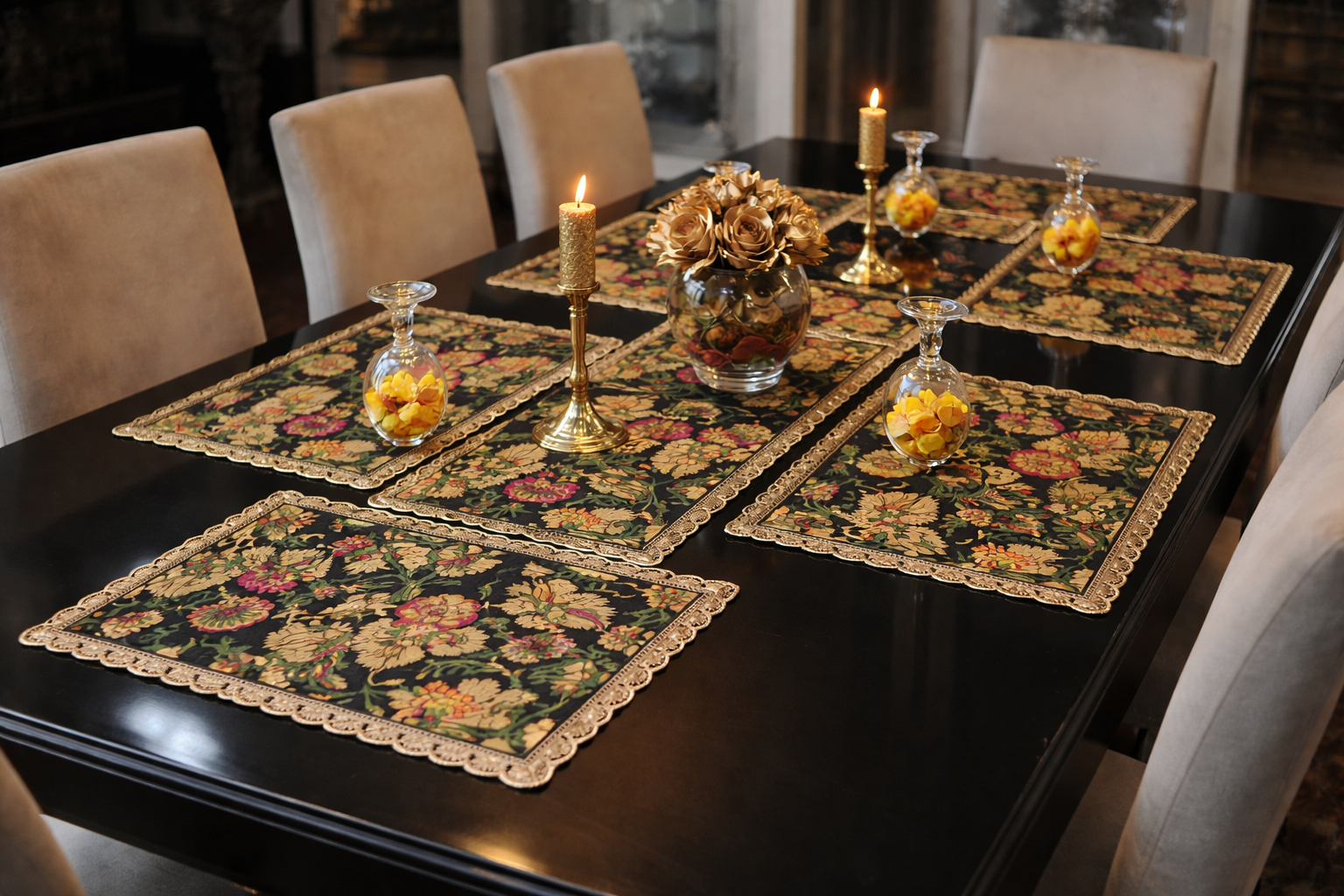 - Golden gota edging frames each placemat, adding a festive glimmer while keeping the look refined.